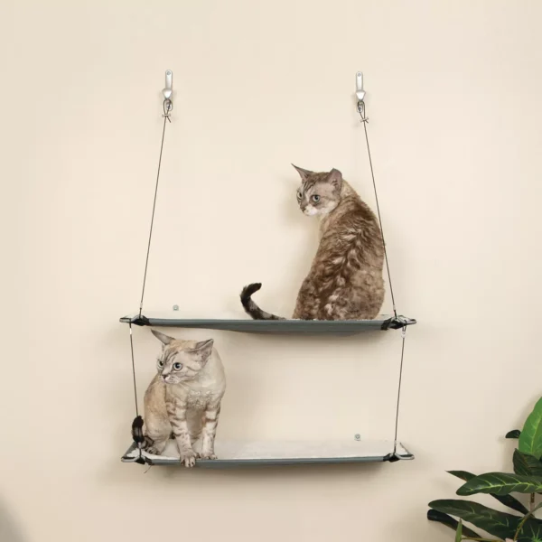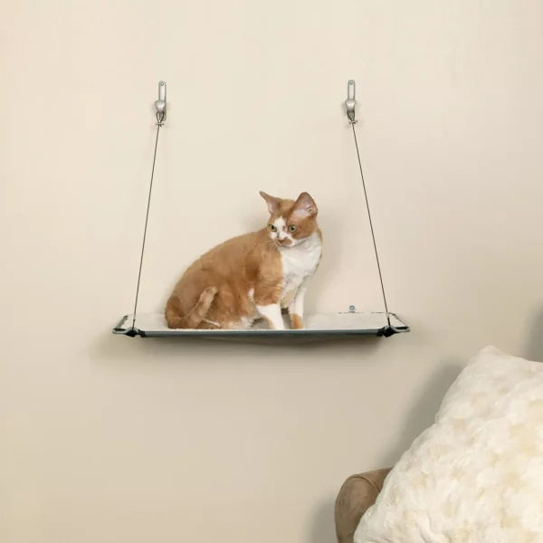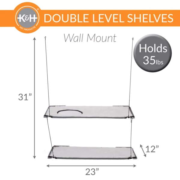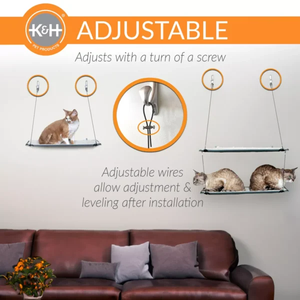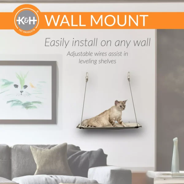 Cats will love having an elevated view of their surroundings with the K&H Pet Products Wall Mount Cat Shelf. The single shelf version provides hours of uninterrupted sleeping and lounging. Double the fun with K&H’s Wall Mount Cat Shelf, double shelf version. More than one cat can enjoy hours of lounging and playing. A hole on the top level (double shelf only) lets cats move freely from shelf to shelf. Both versions easily mount to any wall with detailed instructions and the included hardware. Adjustable wires assist in leveling shelves reducing installation errors. All covers of the K&H Pet Products wall mounted cat beds are removable and machine washable for easy wash and care; simply remove the cat perch cover and toss in the washer, then pop in the dryer or line dry. Designed by K&H with OVER 20 years of experience in creating safe, innovative, quality products for pets; one year limited warranty.