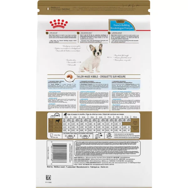 Royal Canin French Bulldog Puppy Dry Dog Food is tailor-made nutrition created just for your French Bulldog puppy pure breed. This exclusive breed-specific diet is uniquely formulated for your medium breed puppy, with the specific nutrients to help mid size dogs thrive. The curved-shaped specialized kibble is designed for your Frenchie’s short muzzle and underbite, making it easy for little dogs to pick up and chew. An exclusive mix of antioxidants and vitamin E promotes healthy development of their immune system to keep their bodies growing strong. Exclusive nutrients reinforce the skin barrier for skin support. And this French Bulldog dog food contains a combination of highly digestible proteins, precise fiber content, and high-quality carbohydrate sources to support healthy digestion and to help decrease flatulence and unpleasant stool odors. Once your French Bulldog puppy is over 12 months old, transition them to Royal Canin French Bulldog Adult Dry Dog Food for precise nutrition into their adult years.